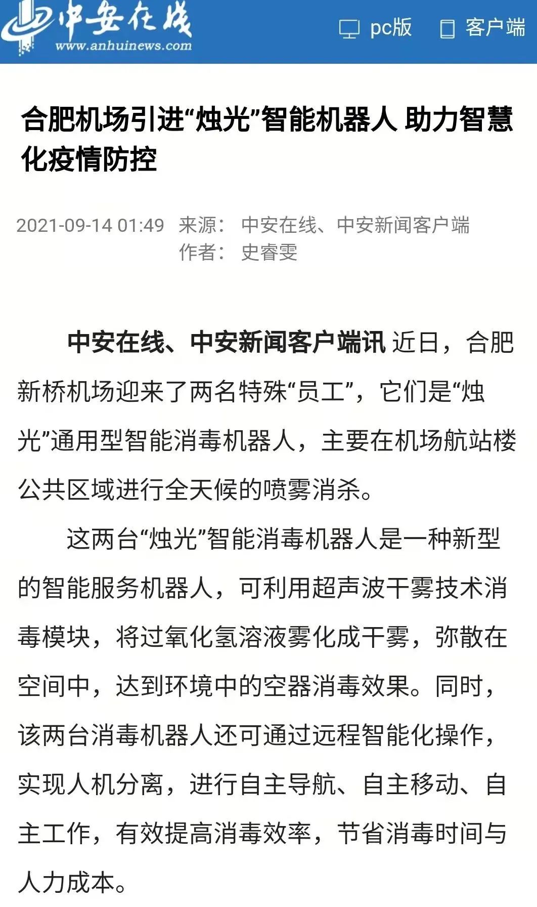 助力合肥机场智慧化防疫 “烛光”消毒机器人上岗