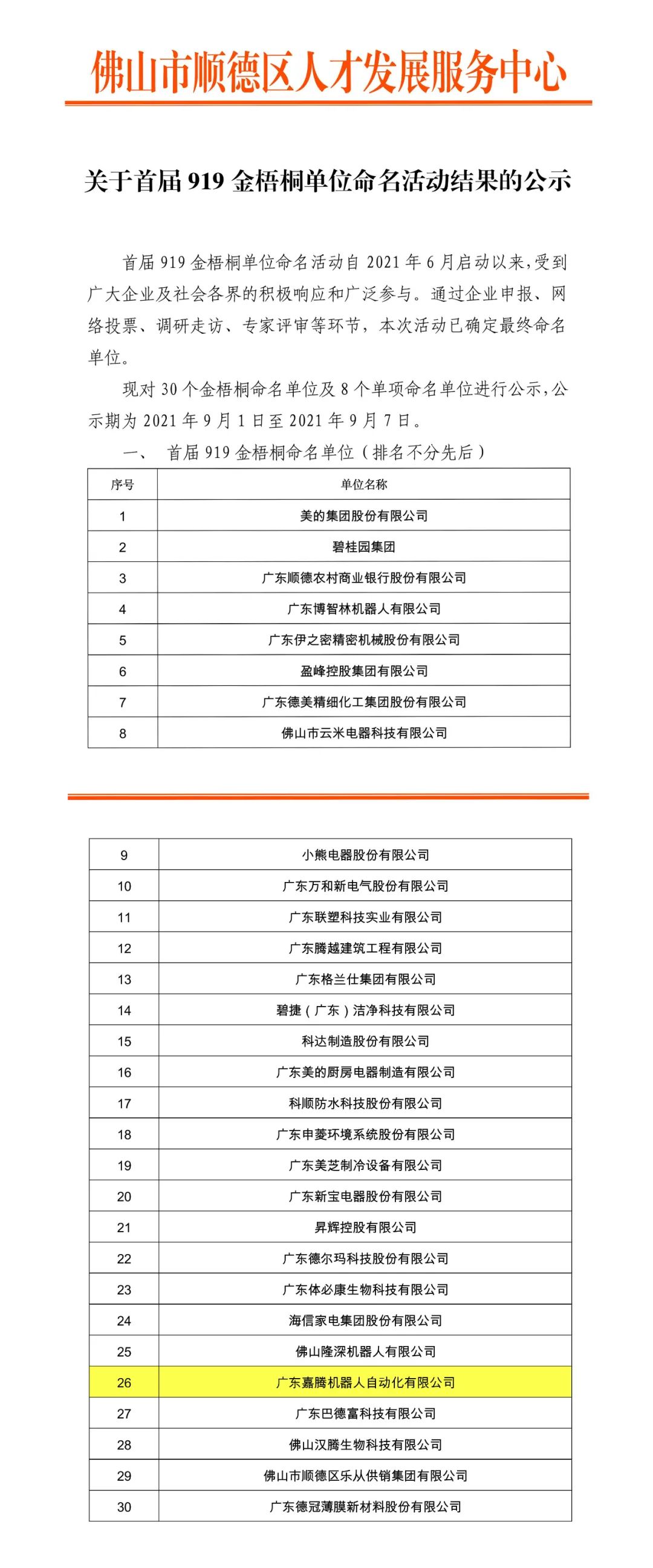 今年推出了首届“919金梧桐单位”命名活动,共有143家企业参加评选,经过引、育、留、用多维度的科学评价,诞生了30家919金梧桐单位和8家919金梧桐单项命名单位。嘉腾机器人荣获首届“919金梧桐单位”称号。