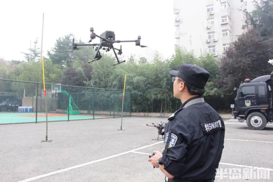 近日,记者来到位于四流南路上的青岛市公安局特警支队,刚进训练场地,就看到民警在用小型无人机演练。一架小型无人机在障碍物之间来回穿梭,最后平稳降落。