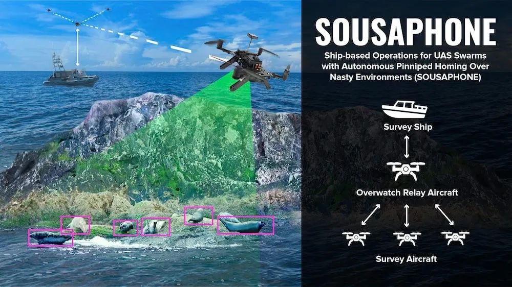 UAS 群作为支持 SOUSAPHONE 的团队的一部分运行,使用自主导航和强大的、最先进的图像处理算法进行海洋哺乳动物检测和分类。SOUSAPHONE是专门为探测凤头鱼而设计的,凤头鱼是包括海象和海豹的动物群体。