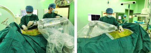 最终,孟磊副主任医师团队在天玑骨科机器人定位下,通过3D图像扫描规划手术中椎弓根螺钉的进钉点、置钉方向以及置钉深度。根据机器人系统导航,通过机械臂精准定位置钉位置,医生只在置钉部位切开约2cm切口,不损伤其它椎关节,保障神经安全和手术的有效性。