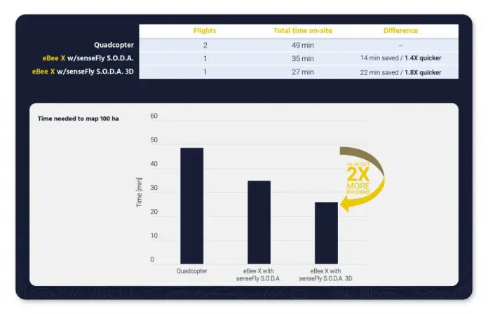 下面,最近比较 100 公顷(247 A)任务的测绘时间的测试结果表明, 由于其效率,带有 SODA 3D 传感器的 eBee X几乎比四轴飞行器快 2倍。