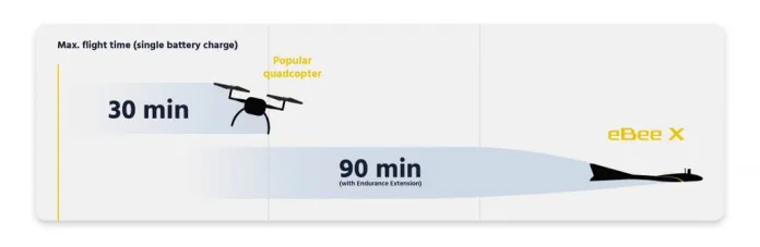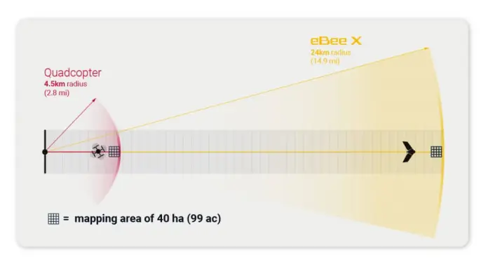 eBee X 固定翼无人机的飞行半径 比典型的四旋翼无人机 大 5.3 倍,同时为进行超视距飞行 等操作提供监管优势。