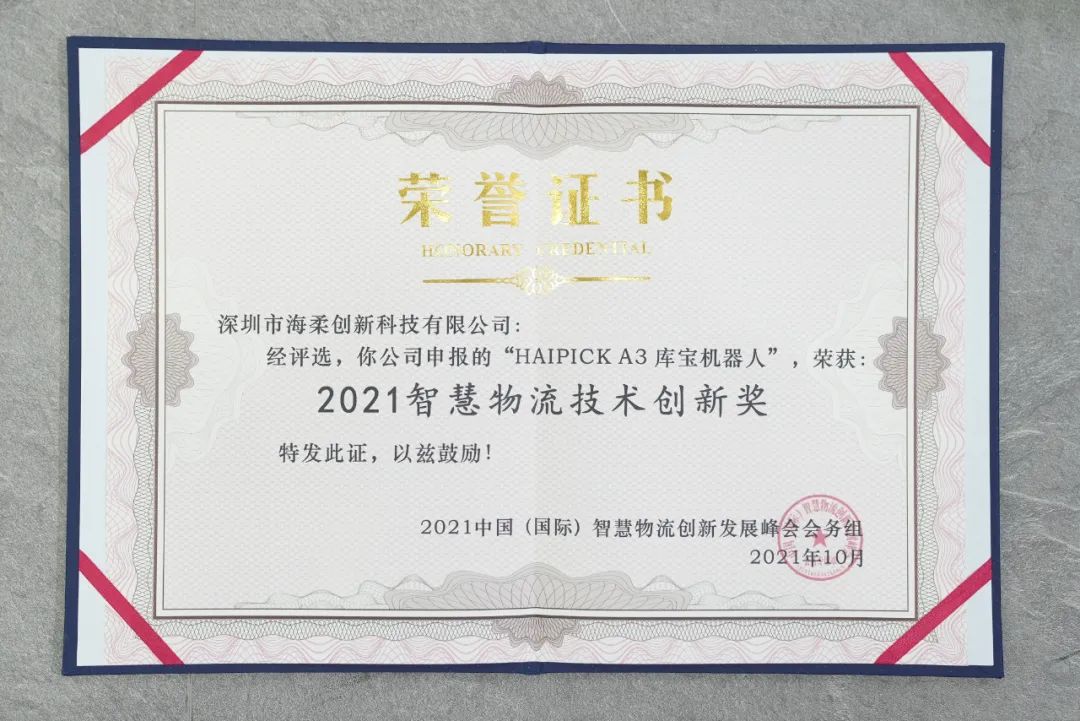 在2021中国(国际)智慧物流创新发展峰会上,海柔创新凭借CeMAT ASIA 2021展会上发布的HAIPICK®A3 托举式拣选机器人一举摘得“2021智慧物流技术创新奖”。