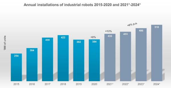 展望未来,全球经济预计将在2021年增长+6%,2022年增长+4.5%。本版WR预测,在2020年,全球机器人安装量将强劲反弹+13%,达到43.5万台,这是由2020年以来推迟的投资、对有弹性的供应链日益增长的需求以及为了支持产能扩张所驱动。在全球范围内,"危机后的繁荣 "预计将在2022年有所缓和。从2021年到2024年,我们可以预期年平均增长率在中等个位数范围内。全球每年安装50万台的大关预计将在2024年达到。