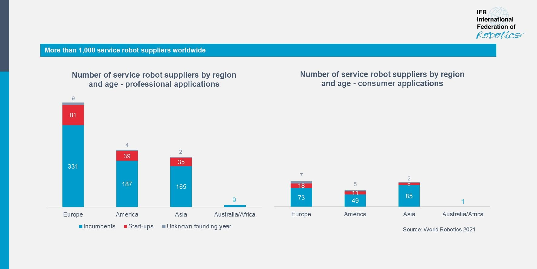 在全球范围内,1.050 家服务机器人供应商中有 80% 被认为是在五年多前成立的老牌企业。47%的服务机器人供应商来自欧洲,27%来自北美,25%来自亚洲。