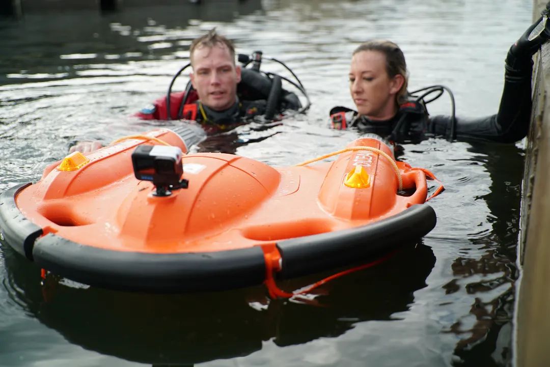 多个无人设备同时出动,不错过任何救援时机。无人机将救生衣和医疗药包空投至被困屋顶人员身旁,暂时确保他们免遭二次安全威胁。而在岸边,救援人员起手一挥,将“海豚1号”水面救生机器人抛入水中。强力的螺旋桨激起浪花,将“海豚1号”快速驶至落水者身旁,原本在水中扑腾挣扎的落水者,立即紧紧抓住并趴卧在“海豚1号”上,最后被安全带回岸边,脱离危险。另一边,无人潜器也被布放入水,搭载着水下摄像头、声纳等设备以探明水下情况,为潜水员进一步搜救提供决策支持。