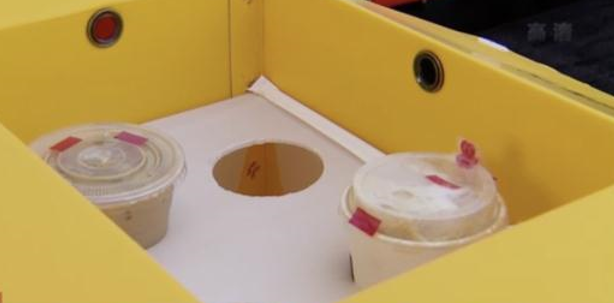 这位顾客点了一杯冰咖啡和一杯热咖啡,因为冰咖啡加了很多冰块,重量比热咖啡要重一些。特别是对体积小巧的无人机而言,肯定会造成一定的不平衡感。但是很显然,在运送过程中感觉到不平衡时,无人机会自动调整餐箱的方向,所以在经过一公里多的飞行后,餐箱里两杯重量不一致的咖啡还是保存得完好如初。