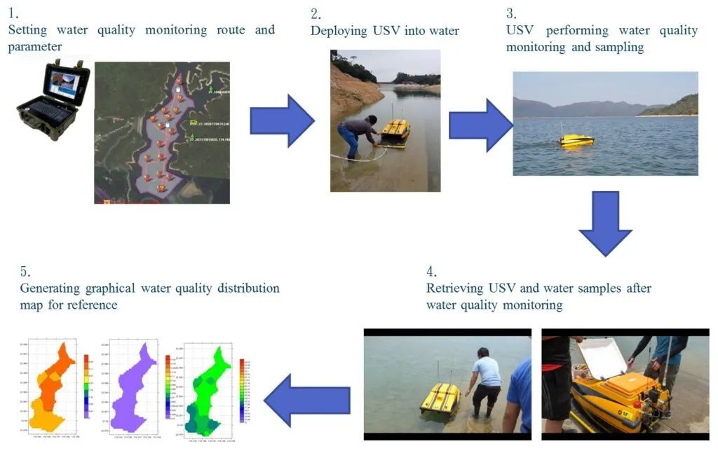 自2017年以来,香港水务署(WSD)总共从OceanAlpha公司采购了五艘自主水样监测船。这些无人船被用来定期监测一个蓄水池的水质。 水务局对水质进行监测,并定期在蓄水池中采集水样,以掌握水质的任何变化,确保水质始终符合世界卫生组织(WHO)的饮用水质量准则。 USVs可以监测12平方公里面积的PCR表面的不同部分,并记录蓄水池地表水质的分布和变化。过去,传统的船只至少需要几天的时间才能覆盖整个区域,而USV船员可以在一天内完成工作量。 使用USV进行水质监测的优势包括以下几点 易于操作和部署 USVs可以由受过训练的技术人员操作,而传统船只必须由有执照的船只操作员驾驶。技术人员可以在水质紧急情况下,将USV系统部署到各个蓄水池工作。 效率 USV的尺寸较小,可以在蓄水池中相对狭窄或浅的区域行驶。它们还可以同时覆盖几个监测点,以提高工作效率。