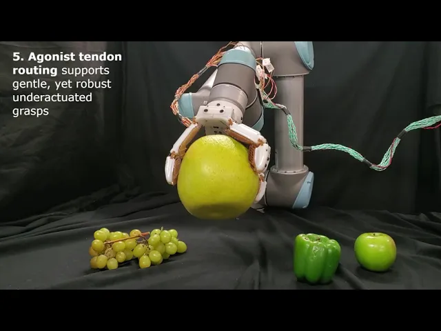 手部的肌腱也很关键,因为它们能够实现超伸的夹持。许多机器人手和夹子会以 "C "形夹住物体,就像只用手指尖来拿东西一样,而farmHand则是用手指的末端按住垫子来夹。这使粘合剂有更多的表面积可以使用。