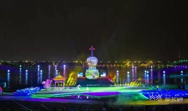 《船说海棠》科技光影秀是中华海棠园名闻遐迩的观赏节目。无数条光柱在空中有韵律的划过,灯光倒映的湖面上,满目航行的小帆船,继而变幻出一只只搏击风浪的海鸥……《船说海棠》一开场,立刻震撼地吸引住了观众。