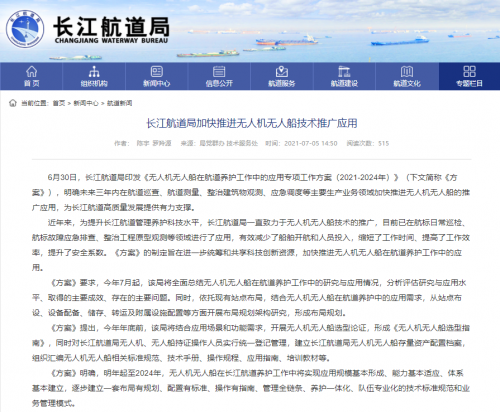 2021年6月30日,长江航道局印发《无人机无人船在航道养护工作中的应用专项工作方案(2021-2024年)》,明确未来三年内在航道巡查、航道测量、整治建筑物观测、应急调度等主要生产业务领域加快推进无人机无人船的推广应用,为长江航道高质量发展提供有力支撑。