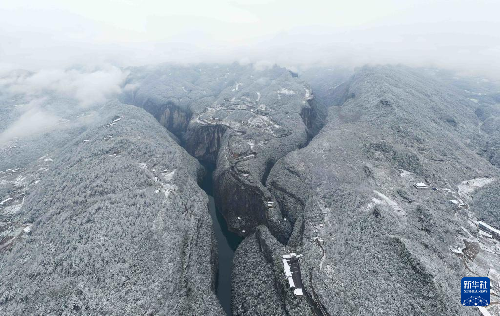 12月27日在湖北省鹤峰县容美镇屏山村拍摄的雪景(无人机照片)。