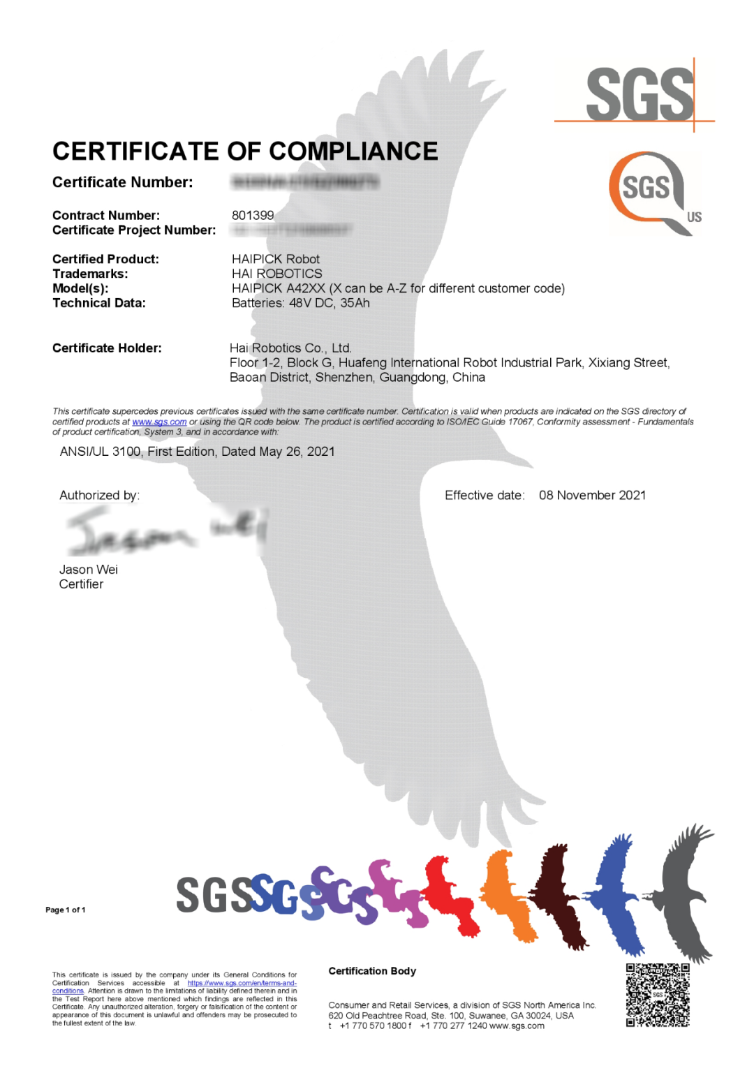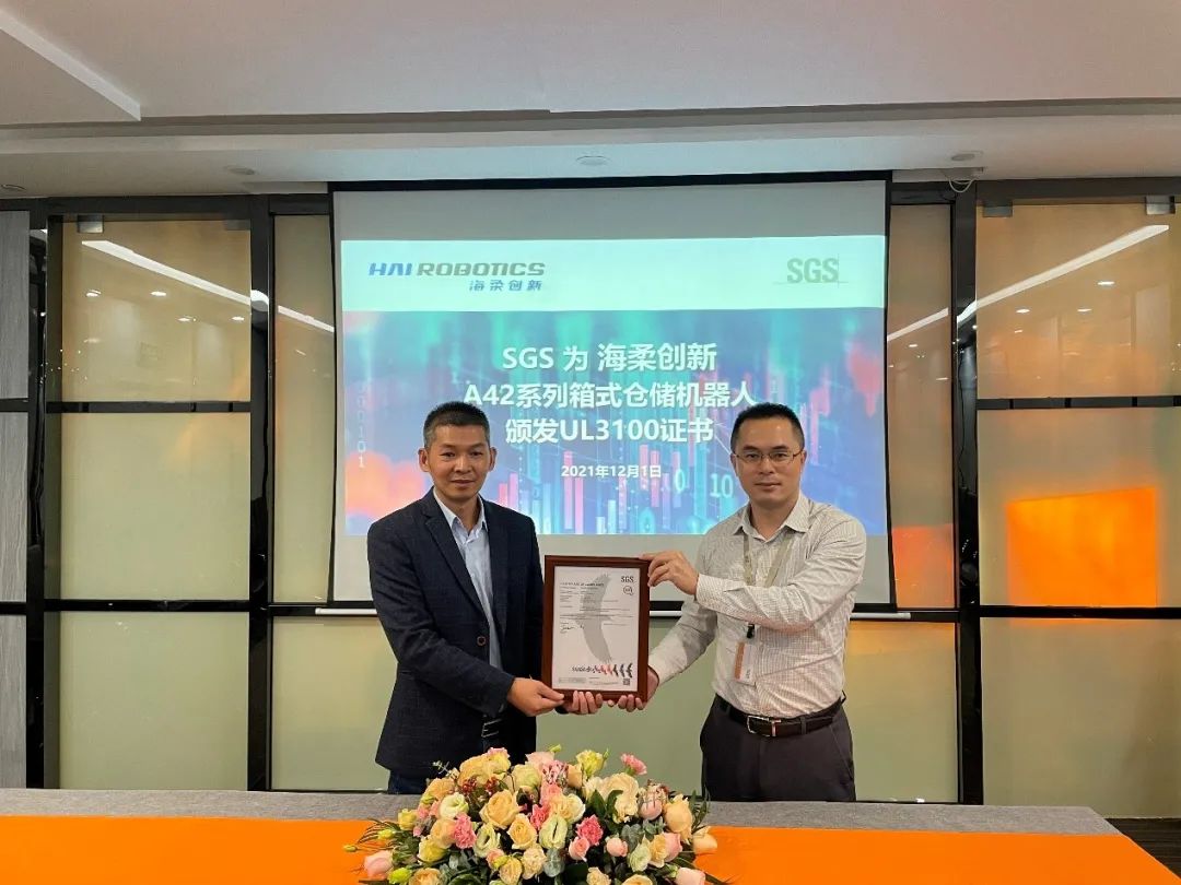 近日,海柔创新作为箱式仓储机器人的首创者和领航者,其自主设计开发的第二代HAIPICK®A42系列箱式仓储机器人,荣获通标标准技术服务有限公司(以下简称“SGS”)颁发UL3100证书。这标志着海柔创新在商用安全标准上再创新高度,对公司拓展全球业务具有里程碑的意义。海柔创新科技有限公司华南区总经理张长盛出席此次颁证仪式。