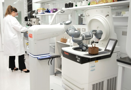 一台ABB协作机器人在一个移动基地上装载 一个离心机。图片来源:ABB