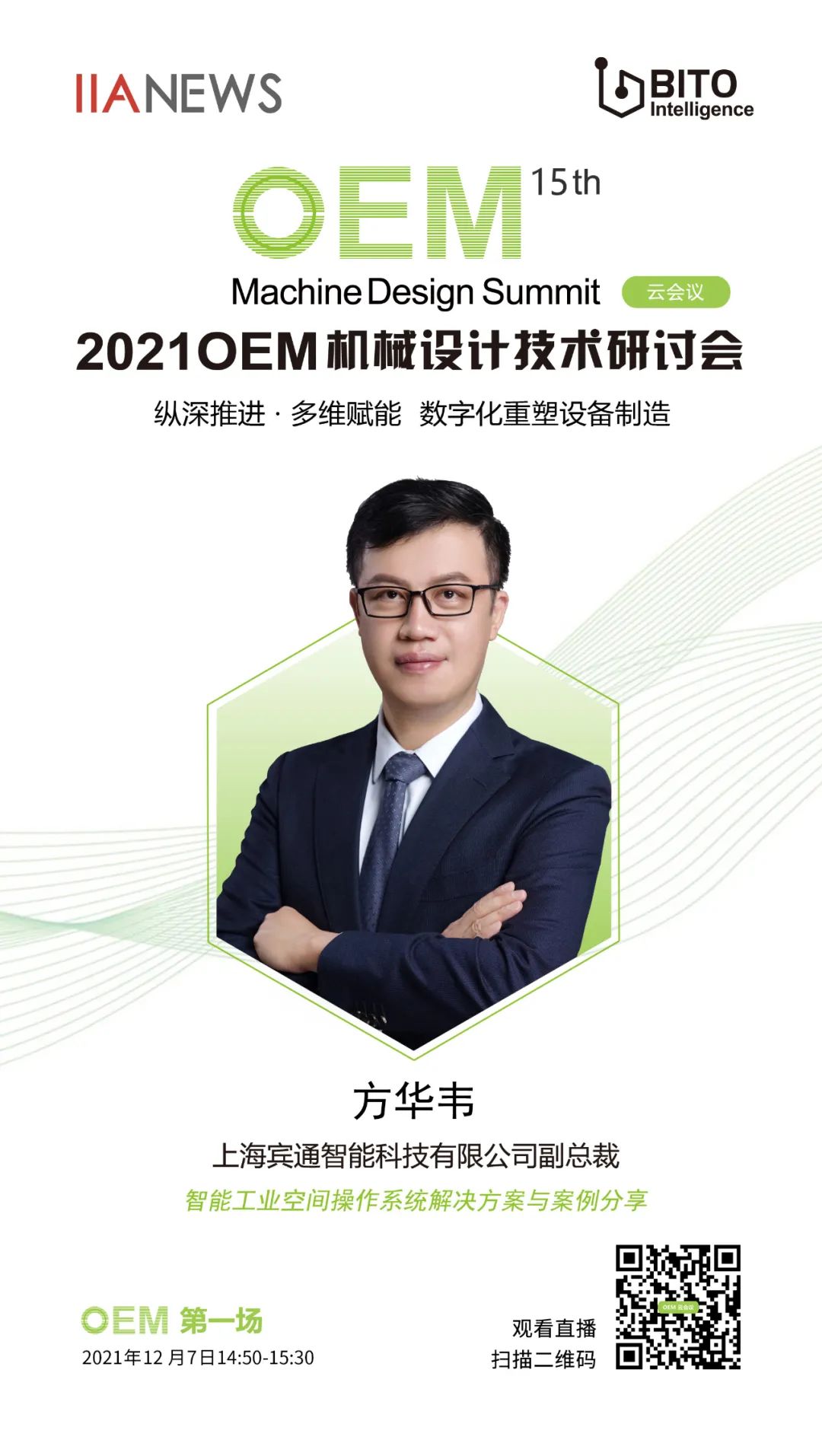 宾通智能副总裁兼BIoT平台首席架构师方华韦先生受邀参加2021OEM机械设计技术研讨会第一场,他将带来“智能工业空间操作系统解决方案和精彩案例”分享。欢迎大家前来围观!