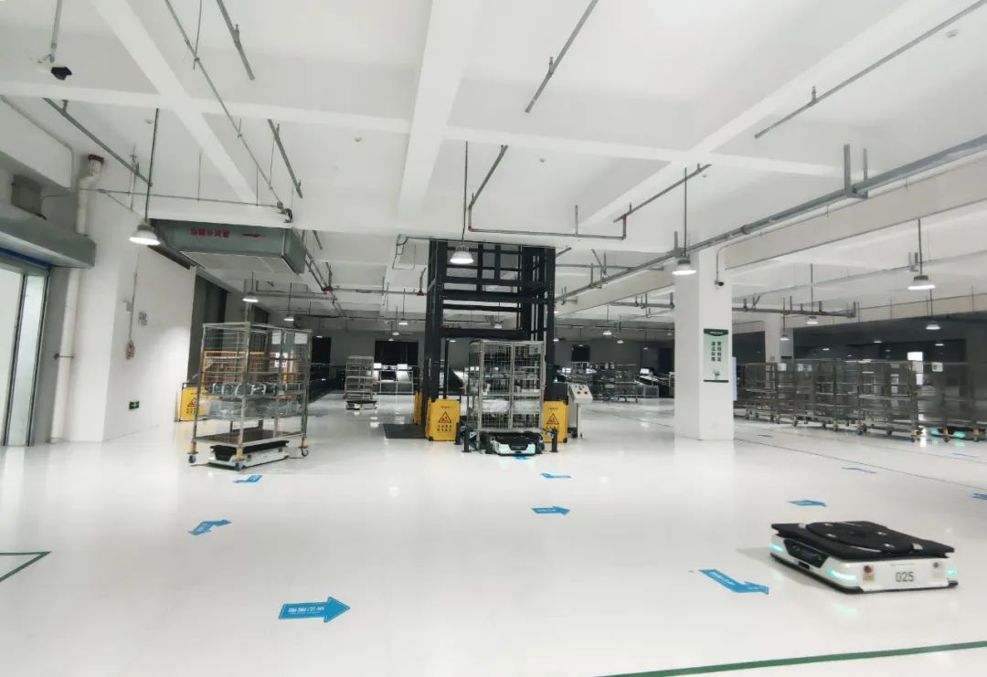 OPPO智能仓库实现了总装材料、包装材料、前加工材料等原材料的智能分拣、拆包,并导入斯坦德AMR代替人工实现跨楼层搬运,将对应工单的物料准确无误地送到指定的生产线。