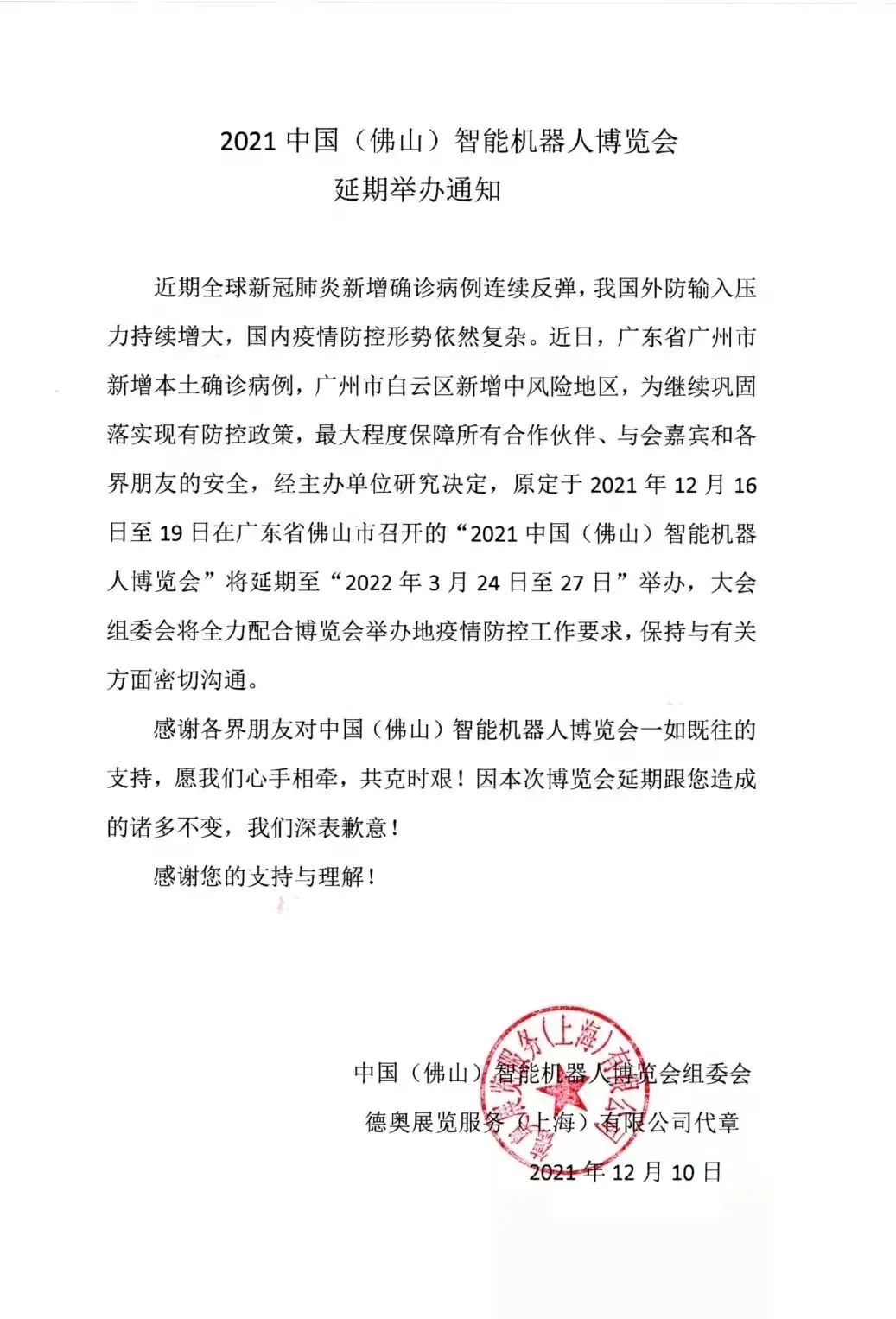 12月10日,中国智能机器人博览会组委会发布了《2021中国(佛山)智能机器人博览会延期举办通知》,近期全球新冠肺炎新增确诊病例连续反弹,我国外防输入压力持续增大,国内疫情防控形势依然复杂,为切实保障每一位参展、观展及受邀嘉宾的健康和安全,以及所有与会人员的健康与切身利益,同时确保展会达到预期效果,主办方在充分听取各方面意见后审慎决定将原定于2021年12月24日至27日在广东省佛山市召开的“2021中国(佛山)智能机器人博览会”将延期至“2022年3月24日至27日”举办。