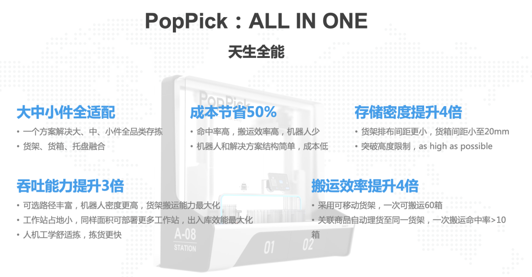 PopPick货到人方案通过“人效、机器人效和机器人密度”三个维度的创新,实现超高吞吐的领先优势。