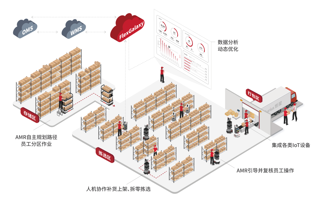 在Syrius炬星真柔性整仓解决方案中,AMR的工作任务基于FlexGalaxy云服务平台,FlexGalaxy深度接入仓库管理系统,得以打通库内整体信息流,同时调整AMR作业流程、调度AMR集群,提升作业效率。