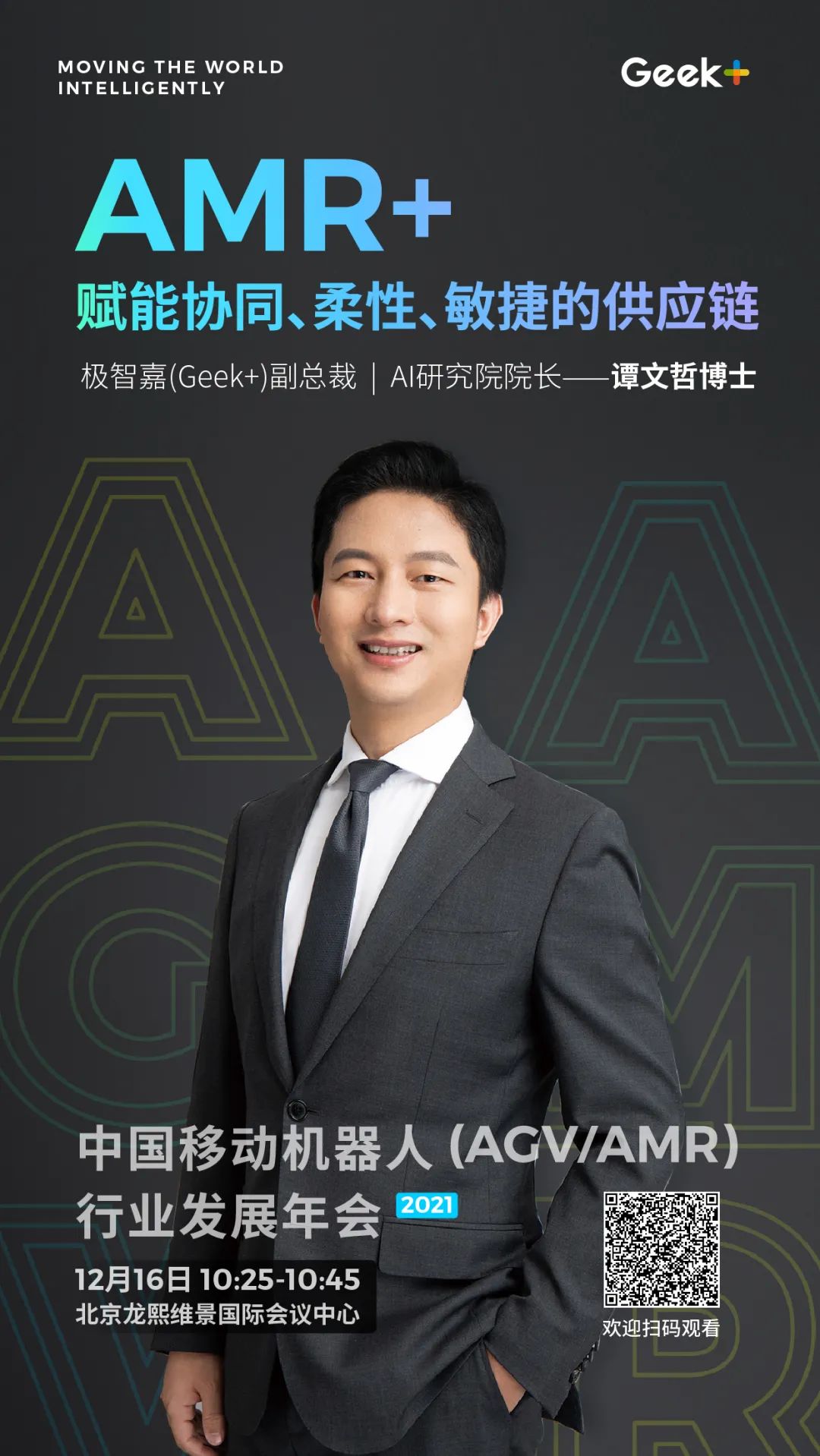 明天(周四)上午10:25,极智嘉副总裁、AI研究院院长谭文哲博士将亮相2021 中国移动机器人(AGV/AMR)行业发展年会,并带来主题为“AMR+赋能协同、柔性、敏捷的供应链”的精彩分享,围绕AMR+分享行业趋势洞察与核心技术展示,欢迎扫码观看直播,亮点纷呈,敬请期待!