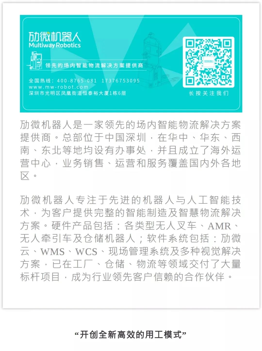 劢微机器人(Multiway Robotics)是一家领先的场内智能物流解决方案提供商。总部位于中国深圳,在华中、华东、西南、东北等地均设有办事处,并且成立了海外运营中心,业务销售、运营和服务覆盖国内外各地区。