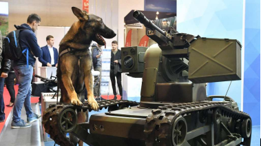 一条警犬在乌克兰基辅的枪展上检查机器人坦克。图片来源:法新社