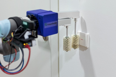 凭借其灵活的清洁工具,DeKonBot 2 可以对不同的表面进行消毒。照片来源:Rainer Bez / Fraunhofer IPA