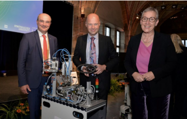 2020年亚琛工程师奖,2021年9月的颁奖仪式:图为(从左至右)亚琛工业大学校长乌尔里希-吕迪格教授、获奖者塞巴斯蒂安-特伦和亚琛市市长西比勒-库彭。照片来源: Andreas Schmitter/RWTH Aachen
