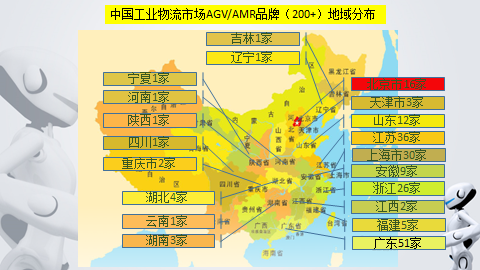 从区域分布来看,中国AGV/AMR厂商主要分布于20个省(自治区、直辖市),其中广东、江苏、上海和浙江是最为集中的区域,数量分别为51家、36家、30家和26家,共计约占比达69%。