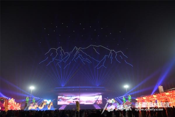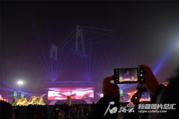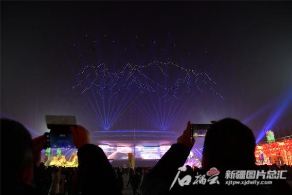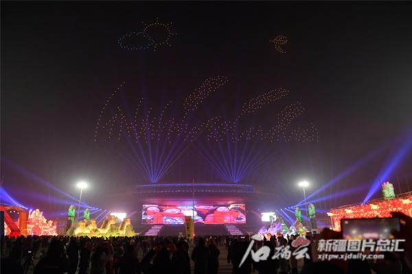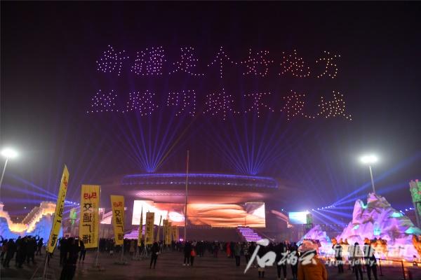 1月1日晚,在新疆国际会展中心,无人机飞行表演现场。记者 邹懿 摄