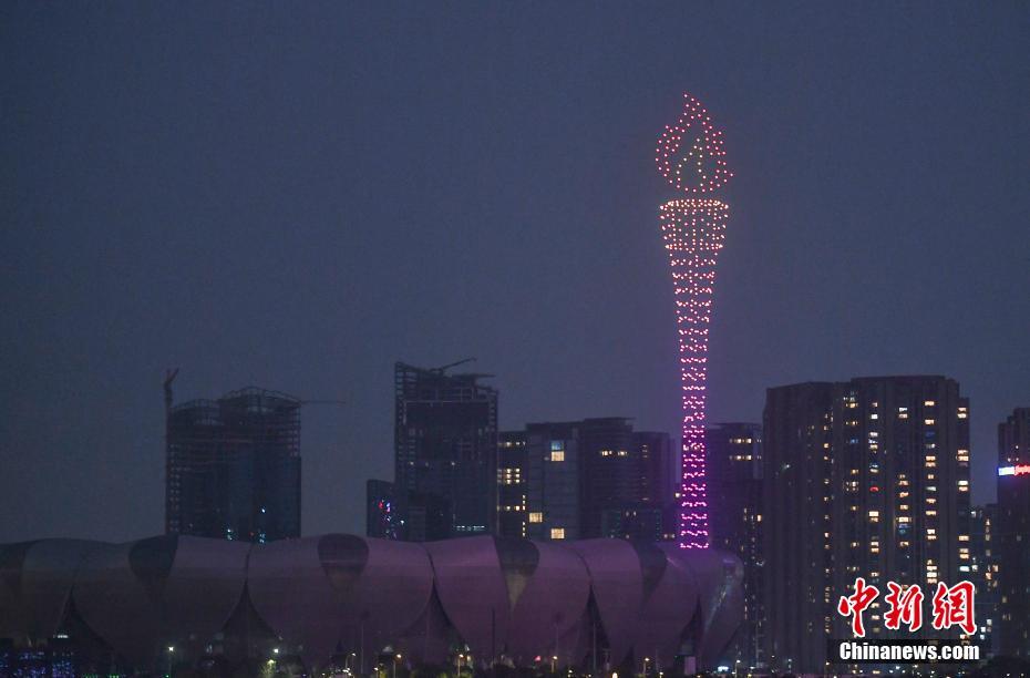 1月11日,浙江杭州启动第19届亚运会倒计时无人机常态化表演,亚运吉祥物、亚运火炬、倒计时等图案亮相亚运场馆上空。 中新社记者 王刚 摄