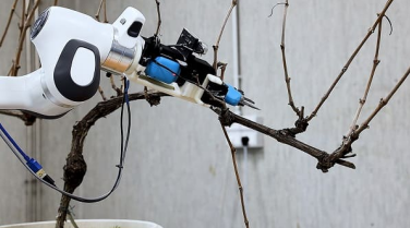 第二个机器人是一个协作臂,安装在四足动物上,配备了用于修剪葡萄的剪子。