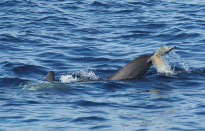自由放养的里索氏海豚(Grampus griseus)在塑料垃圾中游泳。资料来源:Massimiliano Rosso为Maelstrom H2020项目提供。