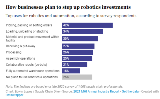 现在,有了需求:电子商务业务的增加、劳动力短缺、叉车司机的短缺和供应链的不稳定,使机器人走上了正轨,特别是在建立弹性方面。在2021年MHI年度行业报告中,在接受调查的1000多名供应链专业人士中,53%的人表示他们正在增加或大幅增加对机器人和自动化的投资,以使供应链更具弹性。该研究还发现,38%的企业今天已经使用了机器人和自动化技术,另有38%的企业预测将在五年内使用。