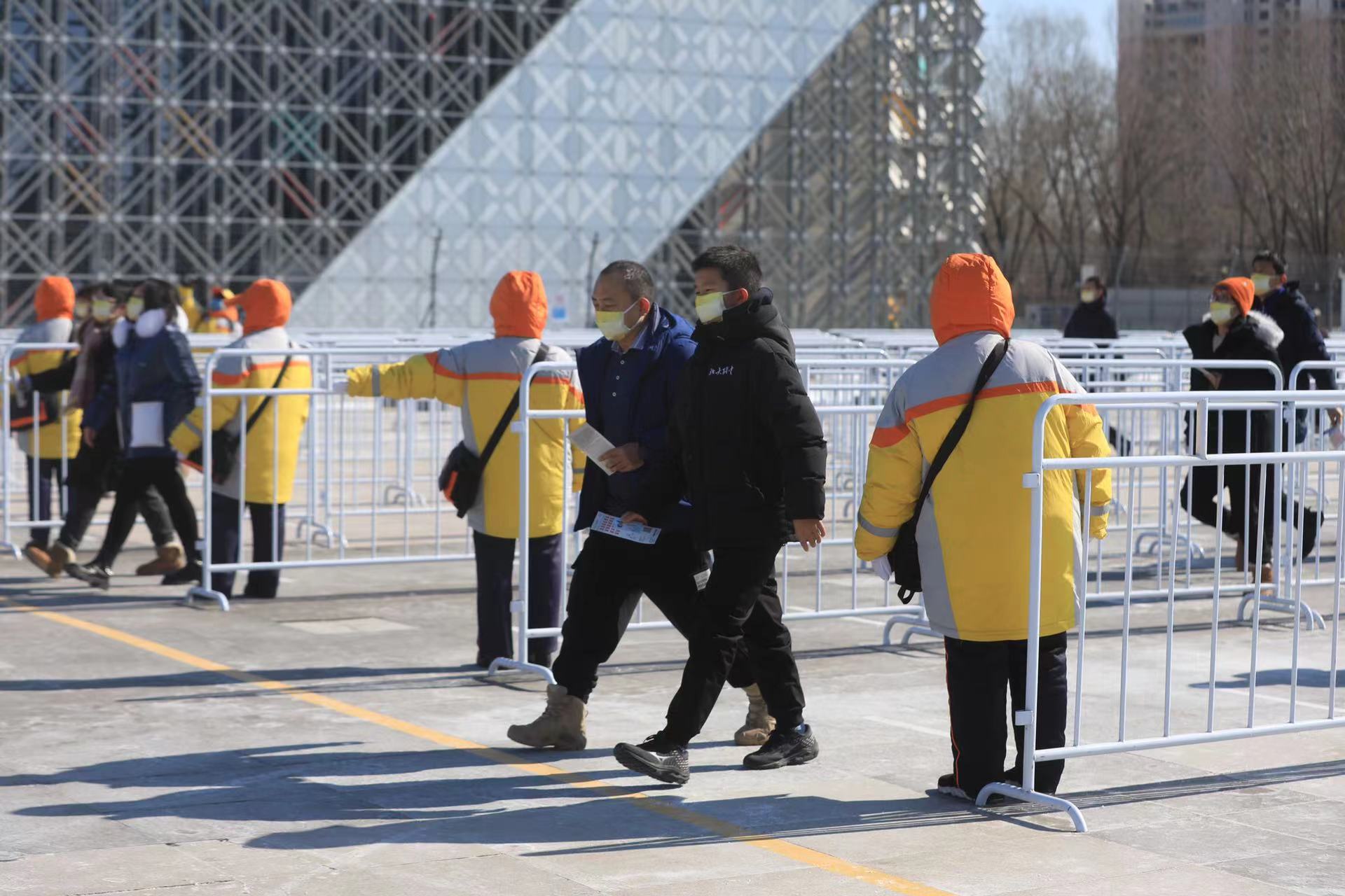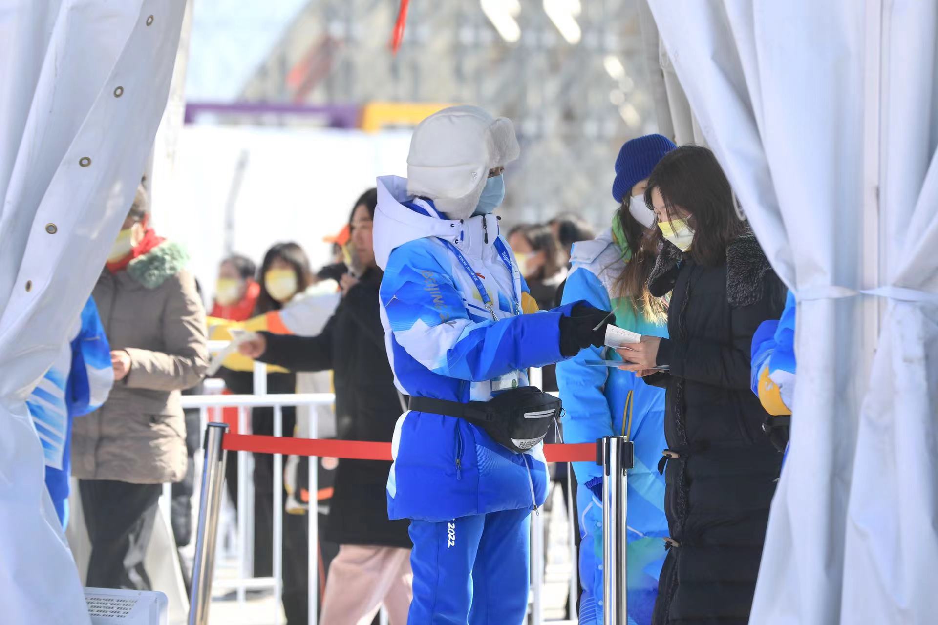 2月16日,五棵松体育馆,观众在志愿者引导下有序安检进入外围场馆。新京报记者 浦峰 摄