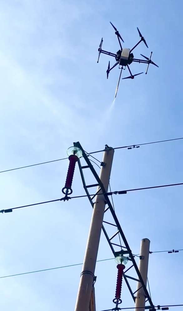 输电线路复合绝缘子在运行过程中,在强电场、日光照射、湿度、酸雨、环境污染等作用下,硅橡胶材料老化,引起憎水性下降或丧失,直接影响输电设备的防污闪性能,导致线路故障。常态化开展憎水性试验,对保证电网安全稳定运行至关重要。传统的试验方式需要人携带专业设备登塔检测,为提升工作效率,降低作业人员安全风险,该公司输电运检中心在无人机下方挂接了水枪喷头和云台相机,自主研制了无人机憎水性试验设备,改变了传统人工登塔作业方式,开启了复合绝缘子健康状态检测“智”时代。