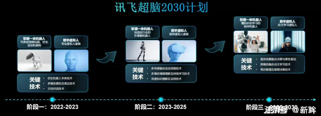 以科大讯飞2030超脑计划规划为例,其根据技术的发展同样规划了三个阶段。第一阶段为2022至2023年,这一阶段,机器人发展的核心目的在于掌握仿生机器人本体技术、多模态感知及表达技术和主动对话技术,让虚拟人在更多的专业领域给予人类帮助。