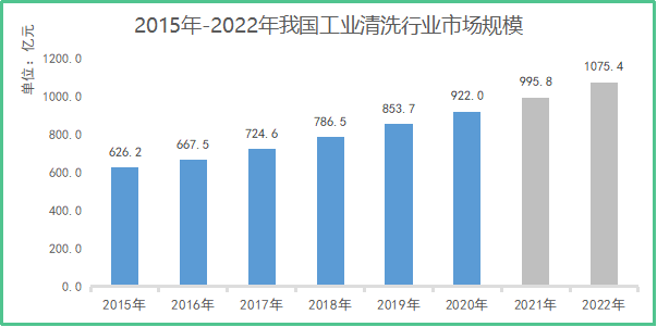 据中商产业研究院相关报告数据显示,我国工业清洗行业规模连年增长,有望在2022年突破千亿大关。