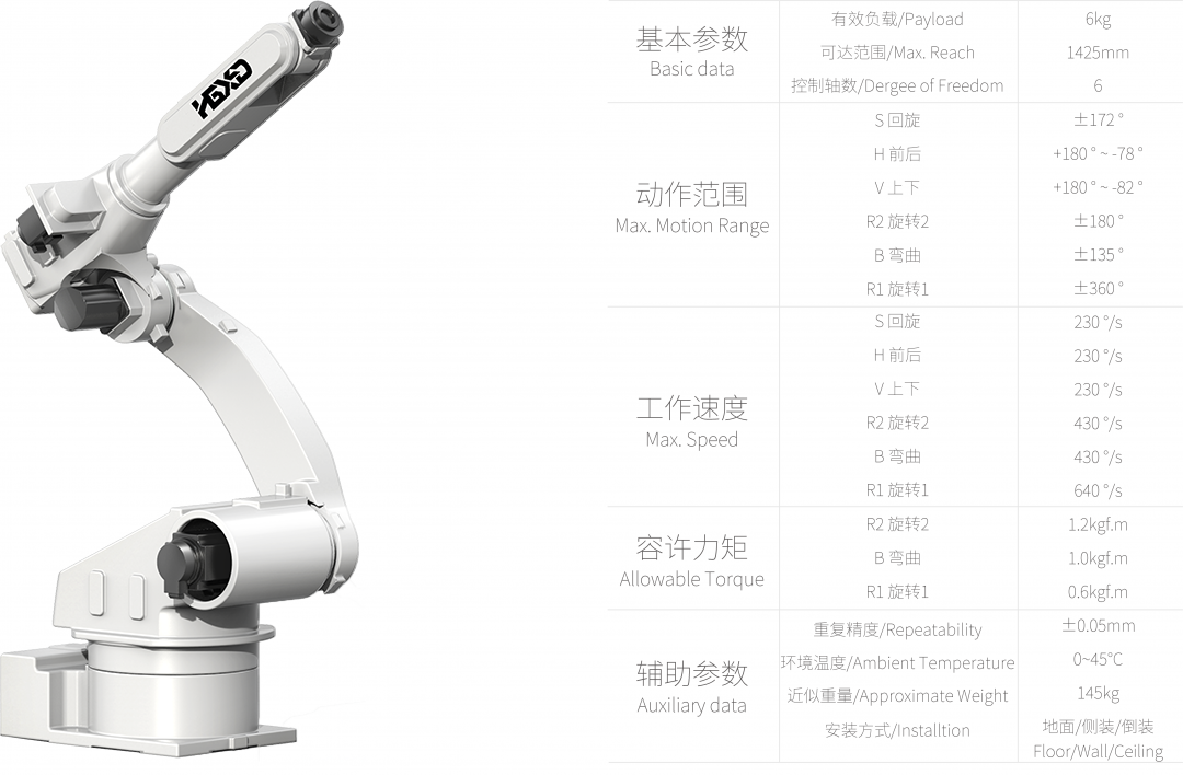该工作站所使用的哈工现代HA006B机型负载能力6kg、可达范围1425mm、重复精度±0.05mm、控制轴数6轴。机型参数如下: