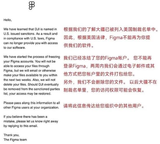 不过,大疆内部在3月12日收到一封Figma的邮件显示:“你好,我们了解到大疆在发布的制裁名单当中被点名,因此根据美国法律,Figma无法再为您提供对我们软件的访问权限。”