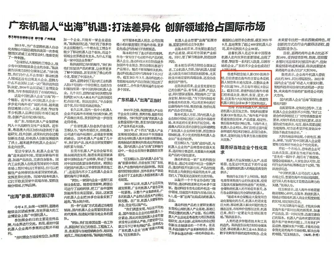 在广东,智能机器人产业集群被列入十大战略性支柱产业集群。粤港澳大湾区加快构建依托于基础研究、技术创新、成果转化的全过程创新生态链,给机器人创新发展提供了沃土。机器人企业“出海”正迎来最好时机,需要深耕海外渠道,加速产品改良,完善自身服务。报道中受访专家认为,国内工业机器人在欧美等国家的中高端市场中暂时难以打开新局,但可以把握住产业转移到东南亚国家的机遇,发挥差异化优势。而国内服务机器人已打开欧美国家中高端市场,要抓住细分领域、打响品牌。送餐机器人是近年来中国服务机器人走向世界的一个重要细分领域。广东的不少企业也成功打入欧美、日韩等国际市场,其中以深圳普渡科技为突出代表。作为全球商用服务机器人“头雁”企业,普渡科技目前已经在海外市场形成北美、欧洲、东亚、亚太、中东、拉美等六大区域发展布局,其机器人销往全球60多个国家和地区。据普渡科技创始人兼CEO张涛介绍,目前普渡在海外的主要业务是机器人销售和本地化服务,在整体业务中占比超70%,并且每年增长5倍以上。