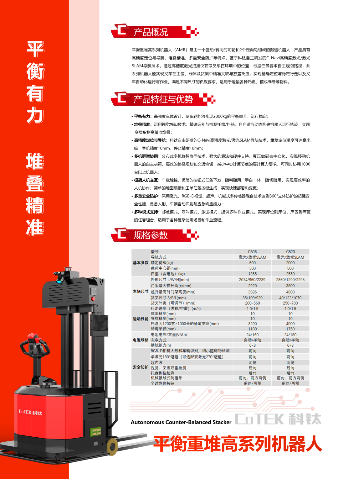 平衡重堆高系列机器人是由一个驱动/转向的前轮和2个定向轮组成的搬运机器人,具有高精度定位与导航、堆叠精准、多重安全防护等特点,主要型号有CB06、CB20。