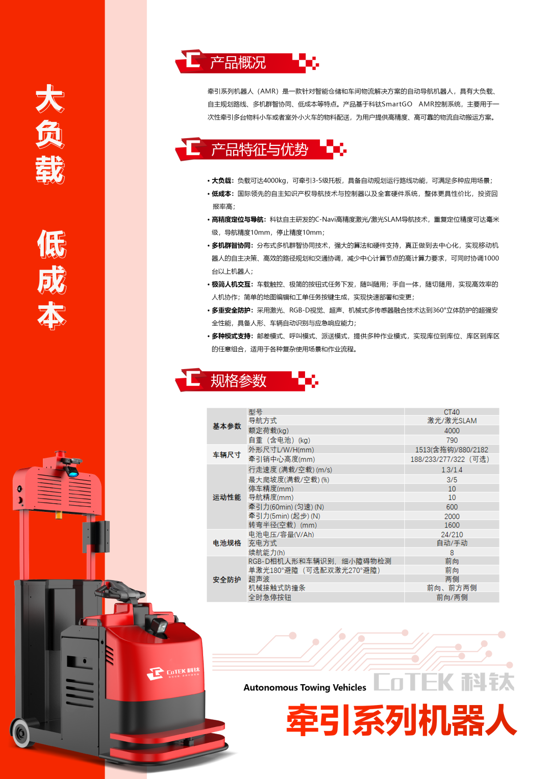 牵引系列机器人是一款针对智能仓储和车间物流解决方案的自动导航机器人,具有大负载、自主规划路线、多机群智协同、低成本等特点。