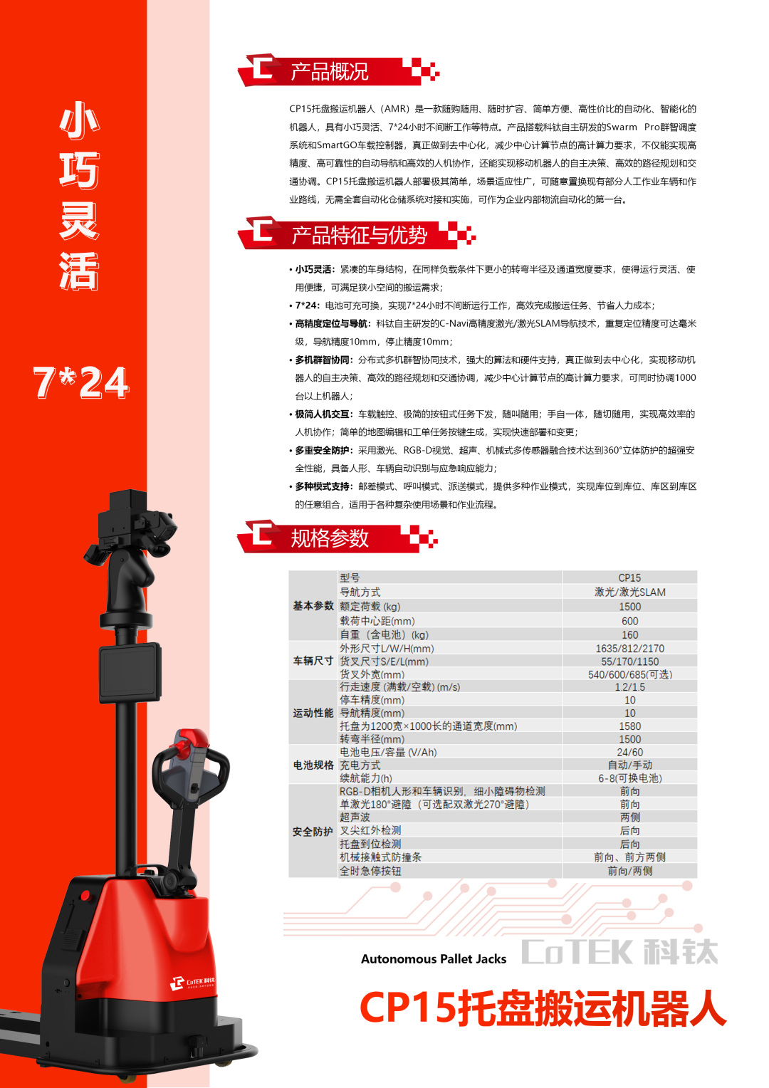 托盘搬运系列机器人主要型号有CP15、CP20、CP20-S,这三款托盘搬运机器人能针对不同场景进行高效搬运作业。