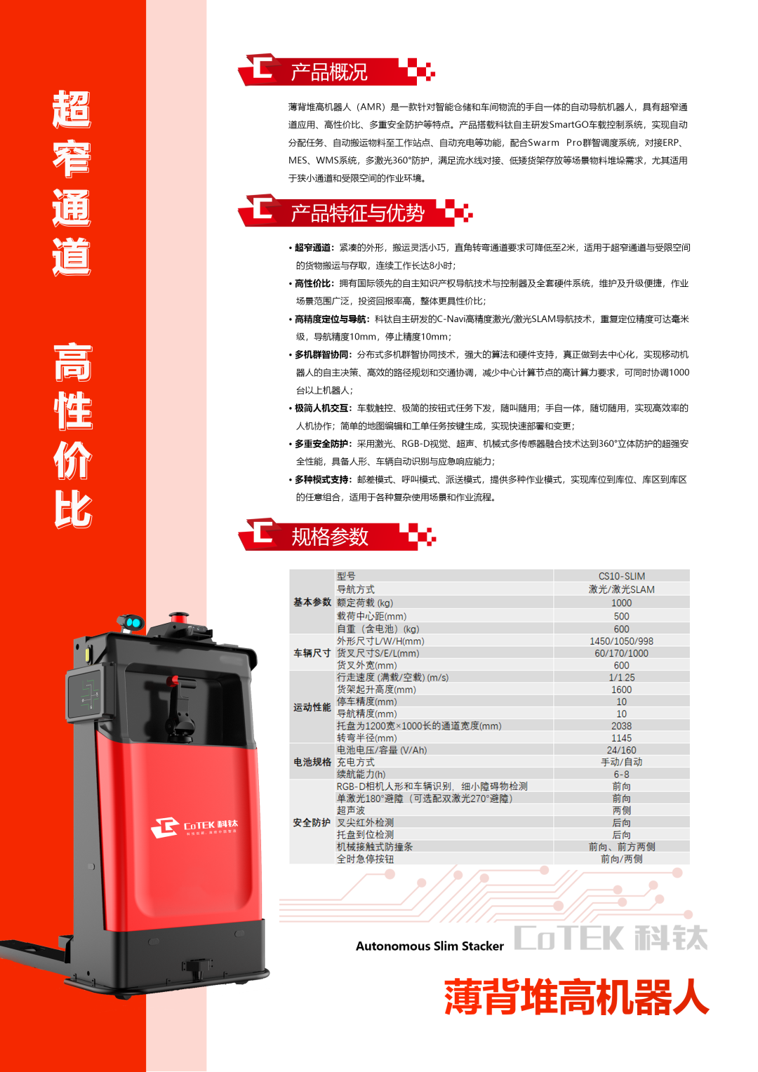 薄背堆高机器人是一款针对智能仓储和车间物流的手自一体的自动导航机器人,具有超窄通道应用、高性价比、多重安全防护等特点,主要型号为CS10-SLIM。