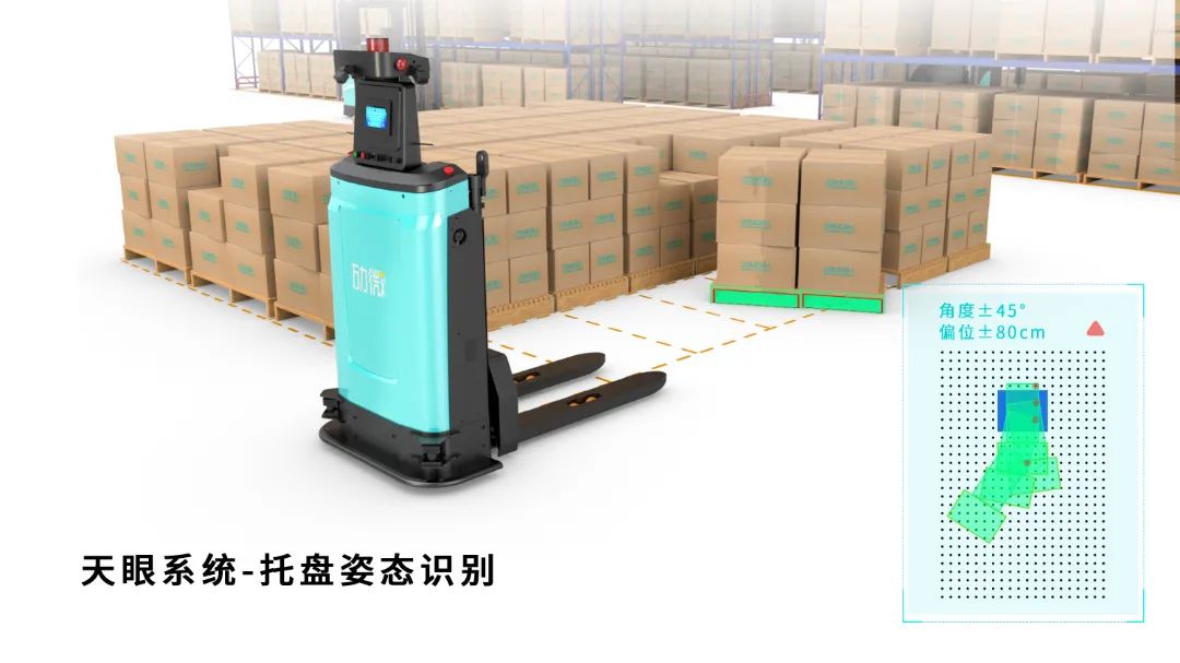轻型堆高式无人叉车MW-SL14,更显轻盈,可在2m 内的巷道灵活运行, 广泛应用于窄通道搬运及堆高作业。本次展会将携“托盘姿态识别”技术重磅演示,在人机交互作业场景,地堆库(并列齐排),人工叉车投放无人叉车取放货场景,人工叉车很难一次放置成功,通常也不会采取放一托货,挪动位置,需人为多次校正。“托盘姿态识别”技术基于视觉与深度学习,快速捕捉到的货物实际位置,调整无人叉车运行路径实现取放货,目前支持托盘角度最大偏位±45°、位移±80cm,极大提升方案柔性化适应程度。