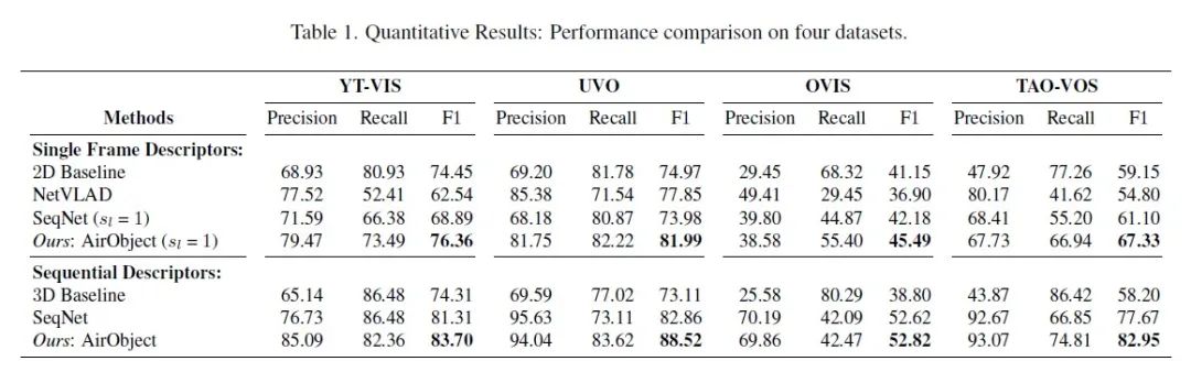 我们进行了大量的实验去验证算法的有效性。新算法在YT-VIS、UVO、OVIS和TAO-VOS都取得了优异的性能,其Precision、Recall和F1-score均比当前SOTA的算法提升较多。