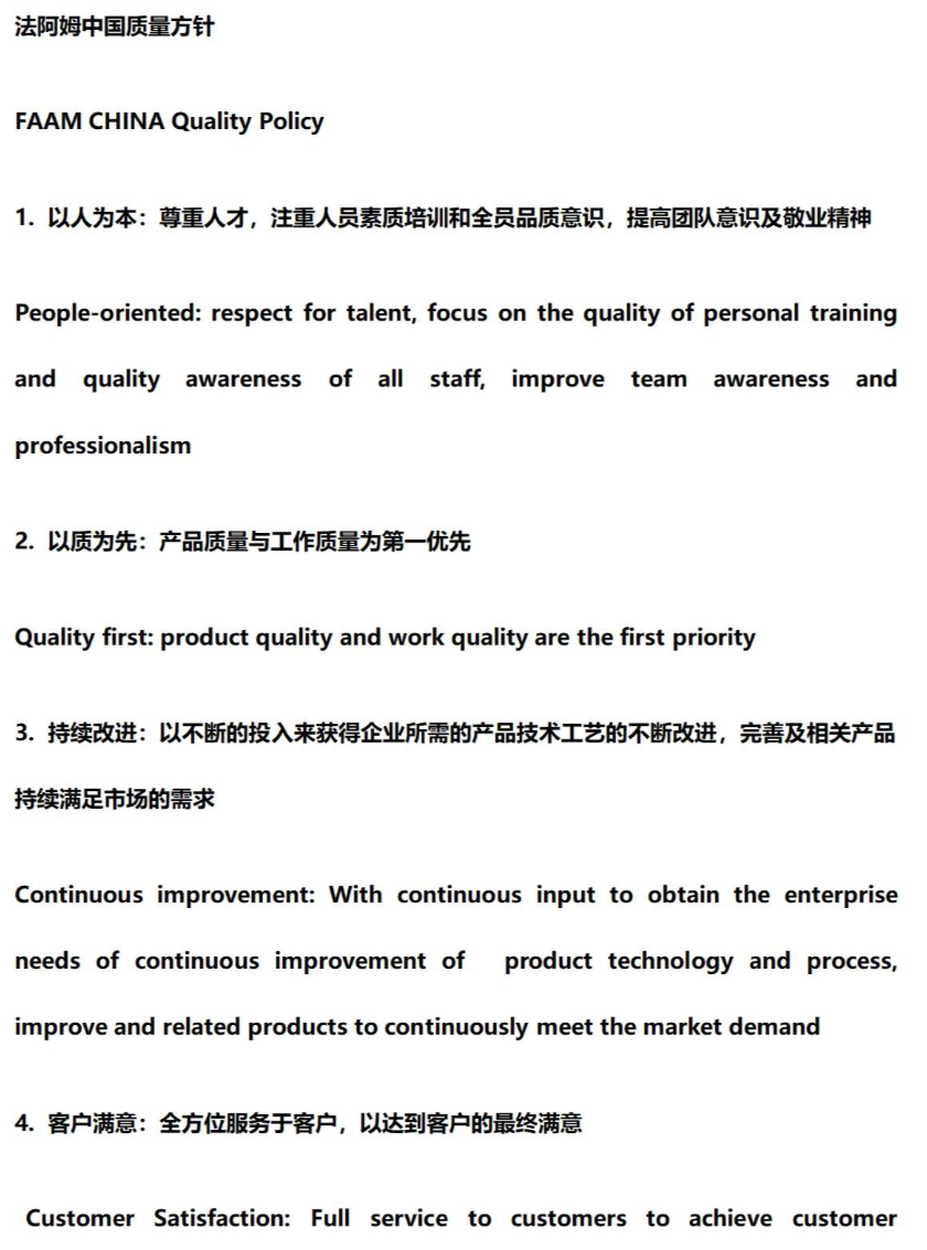 法阿姆中国坚持以人为本、以质为先、持续改进、客户满意,将以优良的产品质量和优质的服务态度时刻准备着与您的合作。