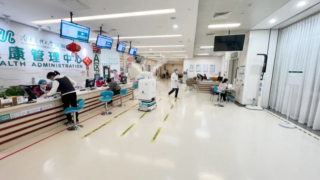 烛光智能消毒机器人正在南方医科大学深圳医院内执行消毒任务。在人流量较多的公共区域,提供全场景消毒服务保障,为来往的医护患者提供更安全的环境。